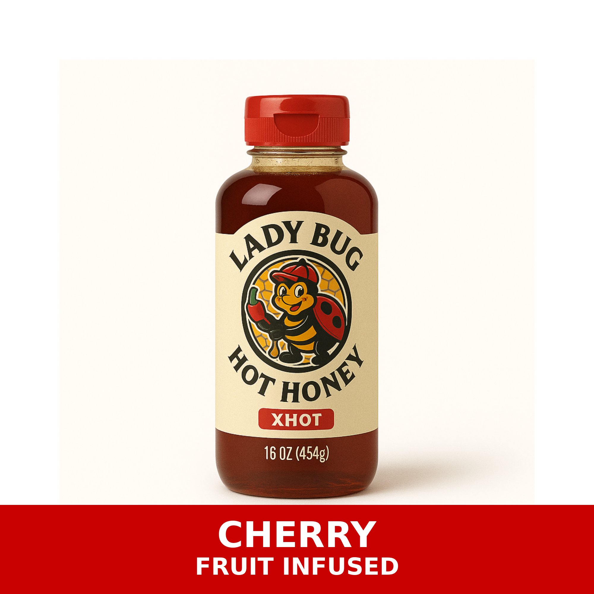 Lady Bug Hot Honey cherry fruit infused honey in a 16 oz squeezable bottle. Clean flavor, premium presentation, and an easy everyday way to shop the fruit collection.