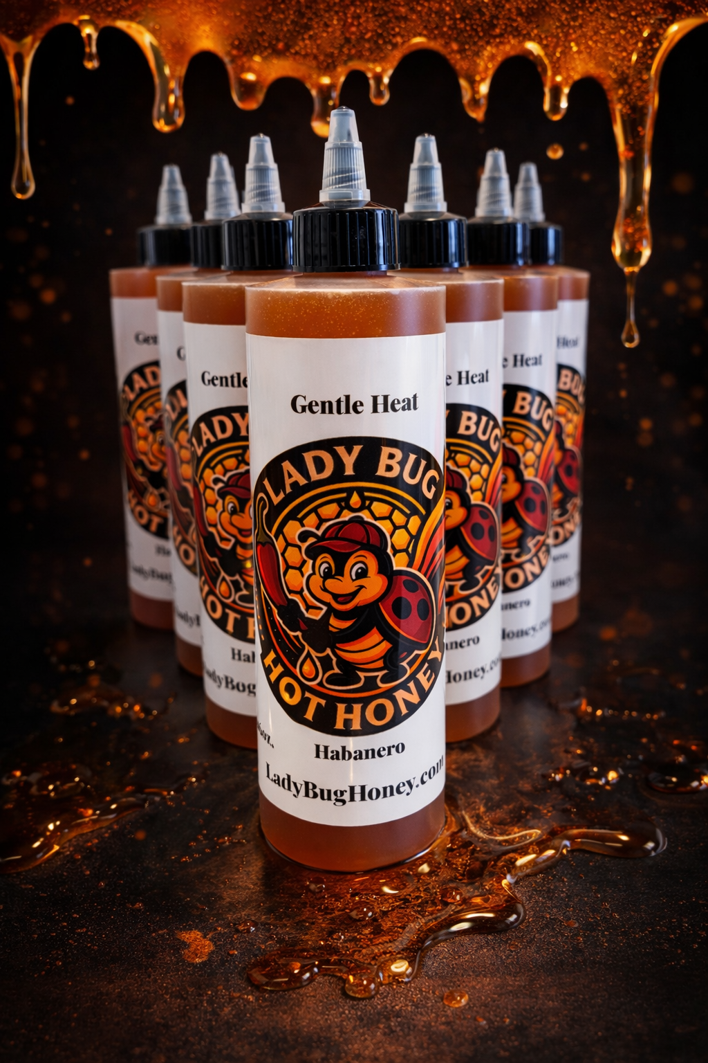 Lady Bug Hot Honey gentle hot honey in a 16 oz squeezable bottle. Choose your heat level and enjoy a clean, premium drizzle for pizza, chicken, charcuterie, and more.