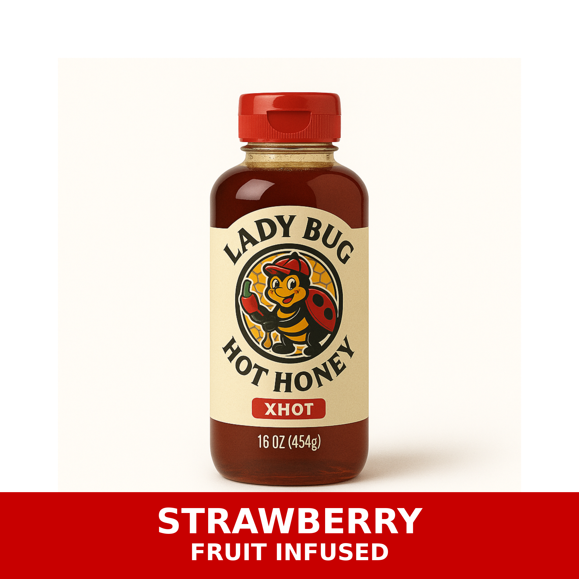 Lady Bug Hot Honey strawberry fruit infused honey in a 16 oz squeezable bottle. Clean flavor, premium presentation, and an easy everyday way to shop the fruit collection.